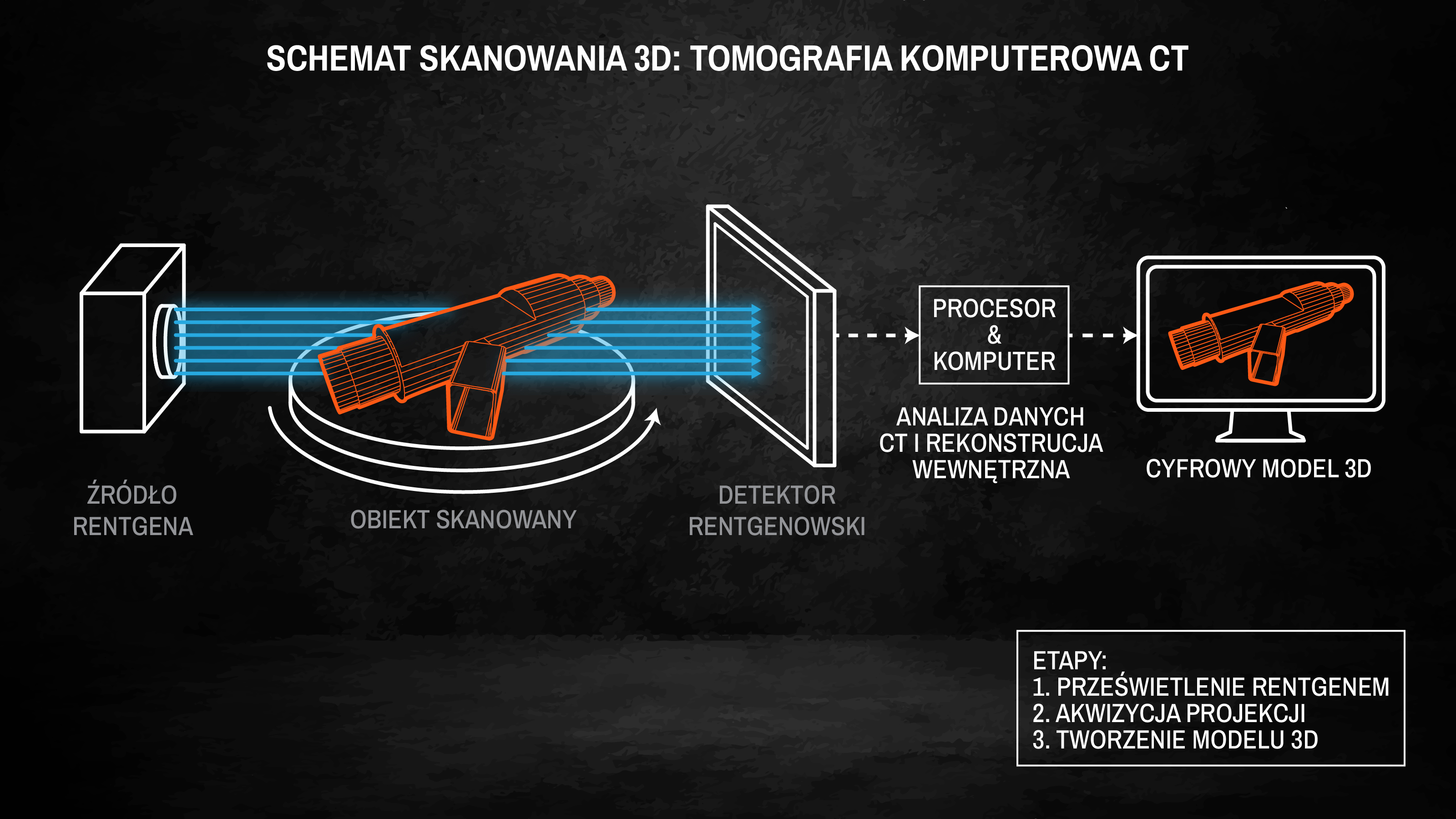 Jest to najbardziej zaawansowana metoda badań nieniszczących (NDT Non-Destructive Testing), wykorzystująca przenikliwe promieniowanie rentgenowskie. W odróżnieniu od skanerów optycznych, które rejestrują światło odbite od powierzchni, tomograf „widzi” obiekt na wskroś, analizując gęstość materiału.